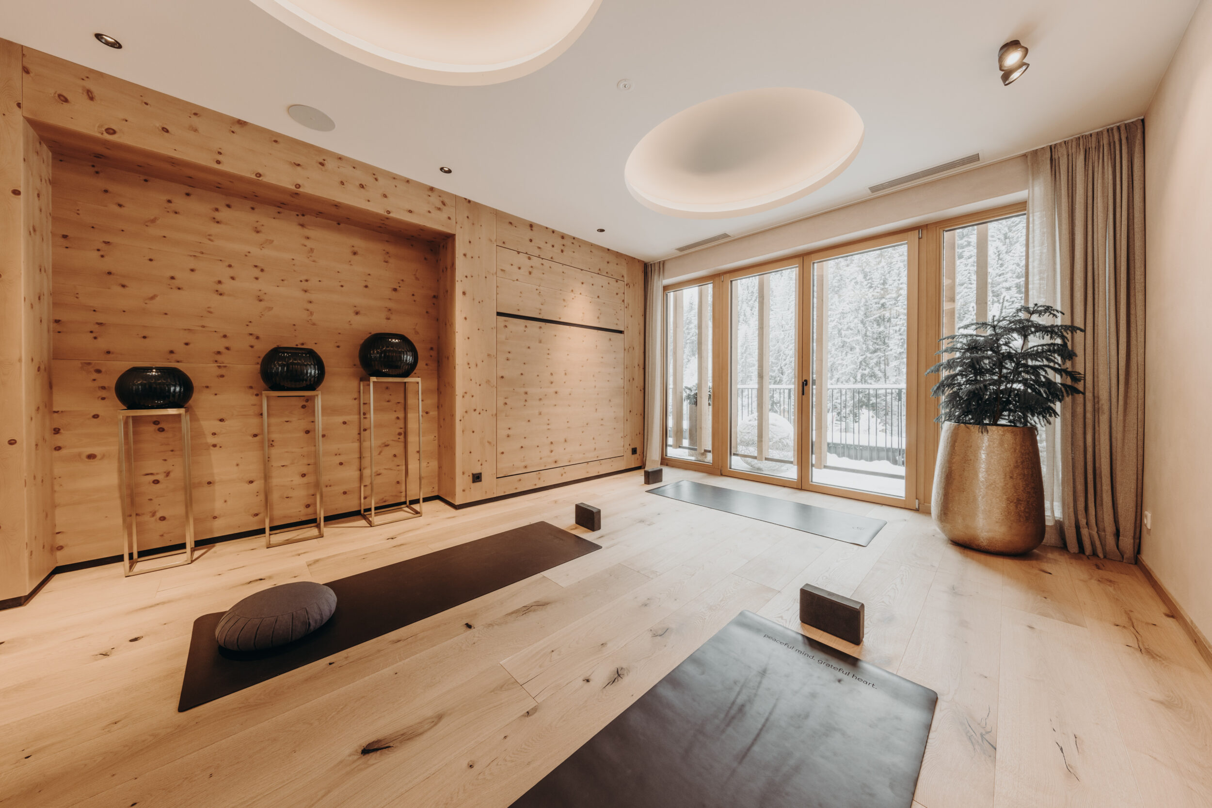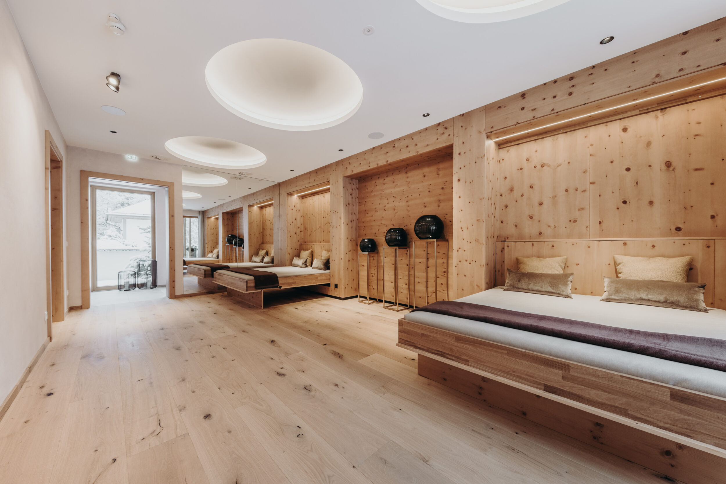Wir führen das Gespräch im stilvollen, neuen Restaurant Egartl der Habachklause, das im Zuge des Umbaus 2024 entstand. Hier hatte sich zuvor eine Terrasse befunden, über die man einmal mehr nach den Plänen von Ingenieurbüro Scharmer den neuen Spa-Bereich baute. Auch Zimmer, Bar und Loungebereich wurden neugestaltet. „Die Familie Maier hat immer konkrete Vorstellungen und vertraut seit Jahrzehnten auf die Expertise von Architekt Hardy Scharmer. Das hilft, weil wir nicht in den luftleeren Raum hinein planen müssen“, sagt Markus. „Auch optisch gibt es einen roten Faden, der sich durch das ganze Haus zieht. Wir wissen, welche Farben, Materialien und Holzarten in Frage kommen, das macht es für alle einfacher.“ Besonders stolz ist Markus auf die aufwändige Zirbendecke im Spa-Bereich – ein wahres Tischler-Meisterstück.