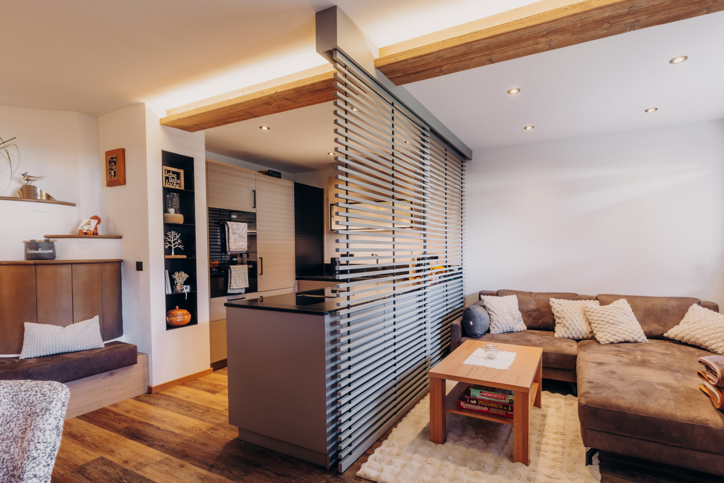 Projektleiter Markus Pichler begleitete die Umsetzung von Anfang bis Ende: mit Malerarbeiten, neuer Bodenverlegung, der Küche, Möbeln aus unserer Werkstatt, der Tür sowie der passenden Couch und den Beistellmöbeln. Besonders schön zeigt sich hier, wie sorgfältig Materialien, Farben und Funktionen aufeinander abgestimmt wurden. Die offene Küche fügt sich ruhig in den Raum ein, die Lamellenstruktur schafft eine leichte Trennung zum Wohnbereich, und Holz, textile Oberflächen sowie warme Töne sorgen für eine stimmige Atmosphäre.